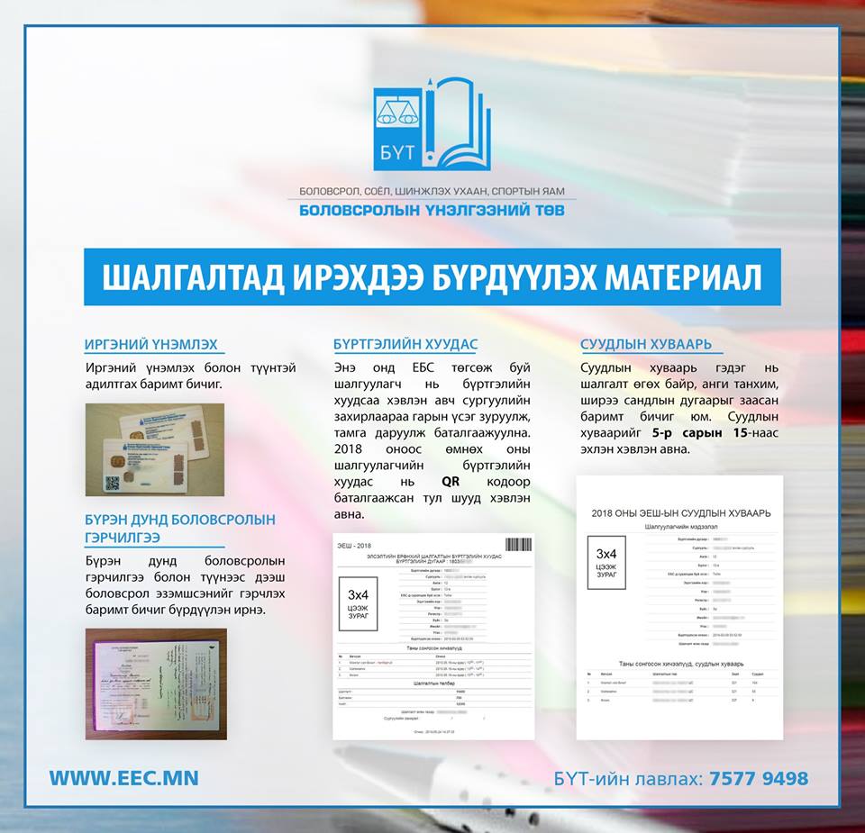 Элсэлтийн ерөнхий шалгалт /ЭЕШ/маргааш буюу зургадугаар сарын 16-ны өдөр улс даяар эхэлнэ. ЭЕШ Монгол хэл бичгийн шалгалтаар эхлэх бөгөөд нийт 43,846 шалгуулагч бүртгүүлсэн байна. Албаныхны өгсөн мэдээллээр эдгээр бүртгүүлсэн шулгуулагчийн 87 хувь нь буюу 37,950 нь энэ жилийн төгсөгч бол 5,896 нь өмнөх оны төгсөгч байгаа юм. Мөн шалгалтад оролцох шалгуулагчид шалгалтад ирэхдээ дараах дөрвөн бичиг баримттай ирэх юм байна. Үүнд бүртгэлийн хуудас. Энэ онд ЕБС төгсөж буй шалгуулагч нь бүртгэлийн хуудсаа хэвлэн авч сургуулийн захирлаараа гарын үсэг зуруулж, тамга даруулж баталгаажуулна. 2018 оноос өмнөх оны шалгуулагчийн бүртгэлийн хуудас нь QR кодоор баталгаажсан тул шууд хэвлэн авах аж. Мөн суудлын хуваарь, иргэний үнэмлэх болон түүнтэй адилтгах баримт бичиг, бүрэн дунд боловсролын гэрчилгээ болон түүнээс дээш боловсрол эзэмшсэнийг гэрчлэх баримт бичиг бүрдүүлэх ёстой. ЭЕШ-ын дүн оноо, жагсаалтыг ирэх сарын 1-ний өдрийн 09:00 цагаас өмнө www.eec.mn цахим хуудсанд байршуулах аж. Мөн шалгуулагч нь шалгалтын дүн, оноог өөрийн бүртгэлийн дугаар болон нууц кодоо ашиглан www.eec.mnцахим хуудаснаас үзэж болно.