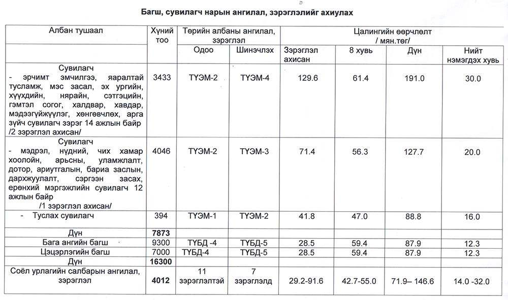 Түүнчлэн эрүүл мэнд, боловсролын салбарт хийсэн ажлын байрны үнэлгээнд үндэслэн бага ангийн болон цэцэрлэгийн багш нарын албан тушаалын зэрэглэлийг нэгээр ахиулж, цалинг 12.3 хувиар буюу 87.9 мянган төгрөгөөр нэмжээ. Харин сувилагч нарын зэрэглэлийн 1-2-оор ахиулж, цалинг нь 20-30 хувиар буюу 127000-183000 мянган төгрөгөөр нэмжээ. Мөн соёл урлагийн салбарынхны цалинг 14-32 хувиар буюу 29000-146000 төгрөгөөр нэмжээ.Төрийн алба хаагчдын цалинг 2014 онд 15 хувиар нэмж байсан бөгөөд энэ нь хувийн хэвшлийн ажилчдын цалингаас 37-45 хувиар бага үзүүлэлт аж. Энэ удаагийн цалин нэмэлтэд 58.1 тэрбум төгрөг зарцуулж байгаа юм байна.