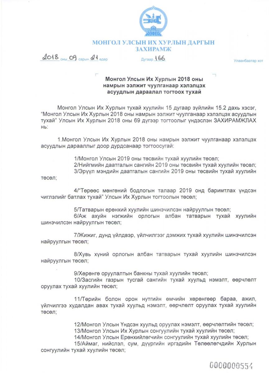 1/Монгол Улсын 2019 оны төсвийн тухай хуулийн төсөл;